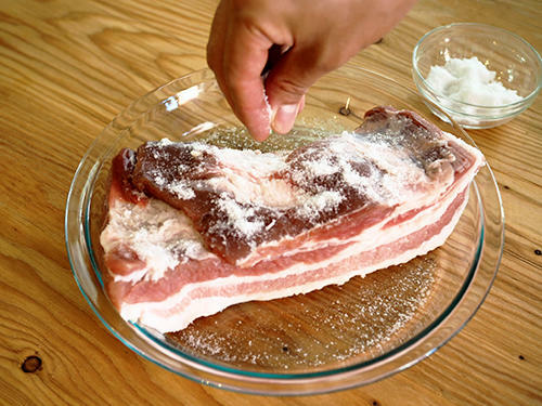 塩豚の材料は、豚肉と塩ととてもシンプル。ゆえに素材の味がダイレクトに反映される。塩は角が立つ精製塩を避けること。さらに肉のタンパク質を固くしにくいと言われている岩塩を選ぶとぐっと美味しさが引き立つ。市販の岩塩を使ったハーブ塩などを活用してもよいだろう。
