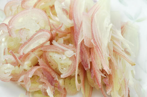 25cmくらいの細長い鉛筆のような見た目で、淡い紅色と白のグラデーションが特徴でもある。みょうがと同様に、さわやかな風味とシャキシャキした食感を楽しむことができる。代表的な産地としては宮城県が有名であり、旬も3~5月頃である。いつでも、どこでも、手に入るというものでもないので、見つけたときにはぜひ、手に取ってもらいたい。