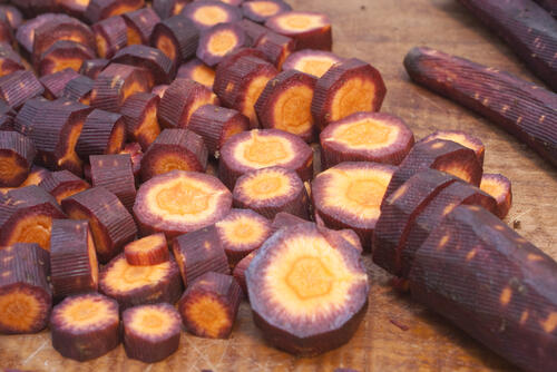 見た目にインパクトのある紫にんじんだが、カットしてみると中の色にビックリする人も多いだろう。じつは、紫にんじんは中が紫色ではない品種もたくさんあるのだ。外側は紫色でも中はオレンジ色や黄色のものもある。紫にんじんを購入したら、ぜひカットして中の色をチェックしてみてほしい。