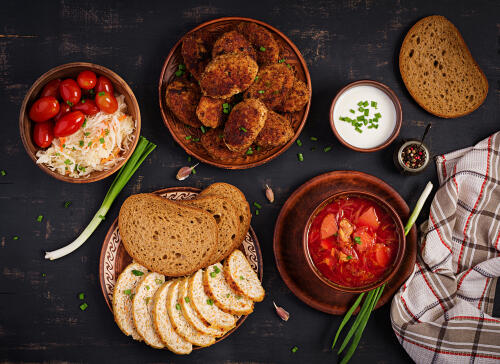 ボルシチを作るとなると、何と合わせればよいか献立に悩みがちである。そこで、ボルシチと相性のよい副菜を紹介しよう。せっかくボルシチを作るなら、副菜もおしゃれにしてテーブルを飾ってほしい。少し食べごたえのある副菜ならグラタンがおすすめだ。野菜をたっぷり入れて、ホワイトソースとチーズをかけてこんがり焼くだけで完成。牛乳とサワークリームでホワイトソースを作ると、さらにボルシチと合う。彩り豊かにしたいなら、オープンサンドもおしゃれだ。薄くスライスしたパンにアボカド、ミニトマト、チーズ、卵、スモークサーモン、生ハムなど彩り豊かな食材でトッピングする。食べやすくてパーティーのような気分も味わえるだろう。バランスよくするために、サラダも1品プラスしたい。ポテトサラダにハーブを加えるとボルシチにさらにぴったりな味わいになる。野菜をダイス状にカットしてミモザサラダにするのもおすすめだ。