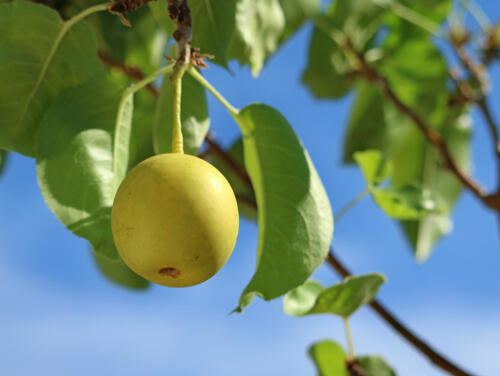 かおりは青梨の中でも青みが強く、青りんごのような色合いが特徴だ。熟してもあまり黄色くならず、ほかの青梨と比べても青みが強いのだ。