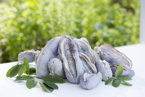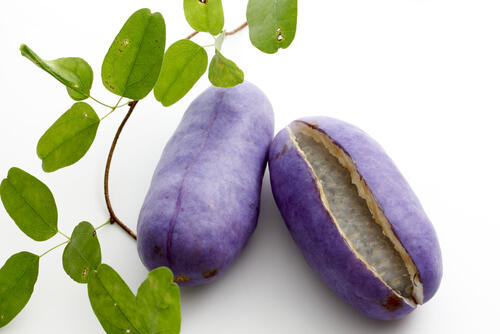 アケビの果実は、秋の味覚のひとつとして古くから親しまれている。形は長い卵型をしており、大きさは6~8㎝ほどで、熟すと紫色の厚い果皮が割れて、中の果実を食べることができる。
