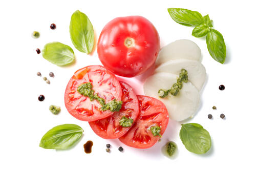 カプレーゼに使用するトマトにはリコピンやビタミンC、ビタミンE、カリウム、食物繊維などの栄養素がバランスよく含まれている。