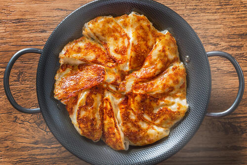 2. スキレットを使うと、包まない餃子をゆっくりと均一に焼くことができる!