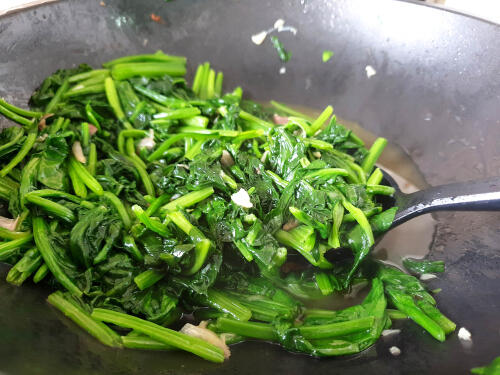 - ニンニクの香りが立ったら青菜をサッと炒める