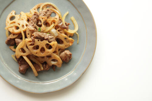 れんこんきんぴらに牛肉を加えると、主菜としても使える料理に仕上がる。牛肉の旨みが野菜にしみ込んで美味しくなるだけでなく、ボリュームも増す。牛肉入りのれんこんきんぴらで献立を作るなら、副菜はほうれん草のお浸し、スープは味噌汁かすまし汁などがよいだろう。