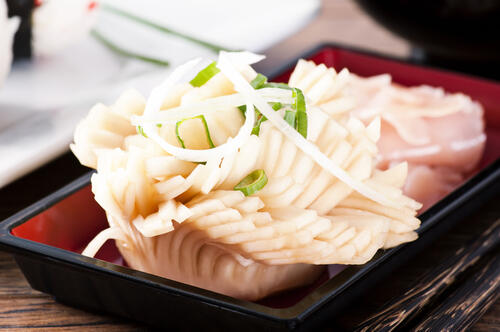 葉の根元があったほうを下に向け、かぶを挟みこむような形で上下に割り箸を置く。そのまま薄切りにする時と同じように縦に切って、切れ目を入れていこう。この時、割り箸は動かさないようにして「薄切りになっているけど、下側は繋がったまま」の状態にするのがポイントだ。縦に切れ目を入れたら、割り箸は動かさず、かぶを90度回転させて、再び薄切りをして切れ目をいれていく。これで菊花切りの完成だ。見た目がとても華やかな切り方なので、おせちの具材にしたりつけ合わせにしたりと、おすすめの切り方である。また、切れ目が入っていることにより、調味料などが浸透しやすいという特徴もあるので、酢漬けにする時に菊花切りをする人も多い。