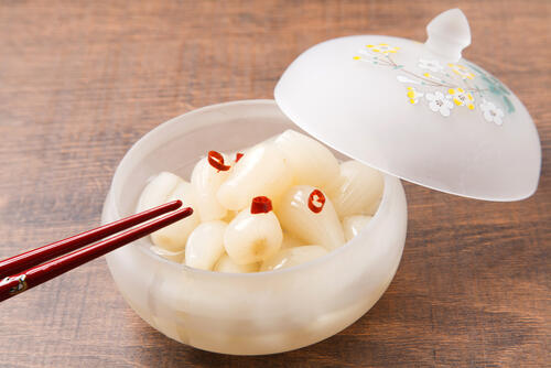 最もポピュラーなのが甘酢漬けではないだろうか。甘酢漬けの場合はらっきょうの根と先端を切り落としてから流水で洗いながら薄皮をむき、水気をきってから保存容器に入れる。鍋に酢・水・砂糖それぞれを1カップ、塩を大さじ2ほど入れ、沸騰したら熱いうちにらっきょうの上からかける。上からラップをして完全に密閉し、ふたを閉めて冷暗所に保管する。食べごろは3週間後からで、1年程度は日持ちする。暑い時期は冷蔵庫で保管するのがおすすめだ。