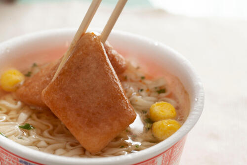 1991年にはきつねうどんの揚げを丸大豆100%にリニューアルした。豆腐屋と同じ製法によって、本物の油揚げと同じようなジューシーさを感じられるようになったのだ。この揚げは1998年のリニューアルでさらに大きく分厚く変わった。