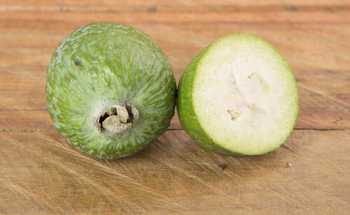 似ているが、フェイジョアの果実は小さく50~100g程度、鶏卵より少し小さいくらいの大きさだ。外皮の表面は濃い緑色をしていて、固くデコボコしている。この皮は薄いがグアバと違って食べるには向かない。カットして食べよう。