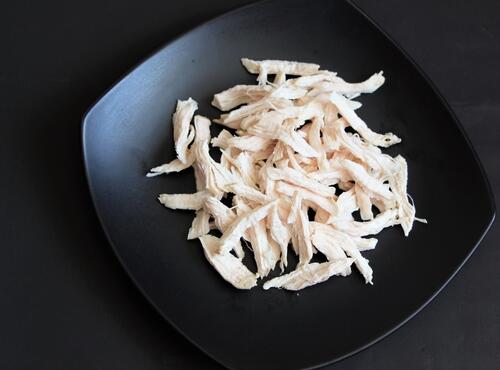 鶏もも肉は、余分な水分をキッチンペーパーなどでふき取る。水気は臭みの原因となるので、しっかりと水気をふき取っておこう。次に、皮や余分な脂肪を取り除く。皮は出汁がよく出るのですべてを剥ぎ取らず、あくまでも余分な部分だけ取り除くようにしよう。こうすることで鶏肉の独特の臭みがなくなり、旨みの部分が強調されてより美味しくいただけるのだ。皮や余分な脂肪を取り除いたら、1つの塊を5つほどのブロックに切り分ける。水の中に入れて、酒や塩と一緒に茹で、繊維に沿って割いたら鶏肉の下処理は完了だ。