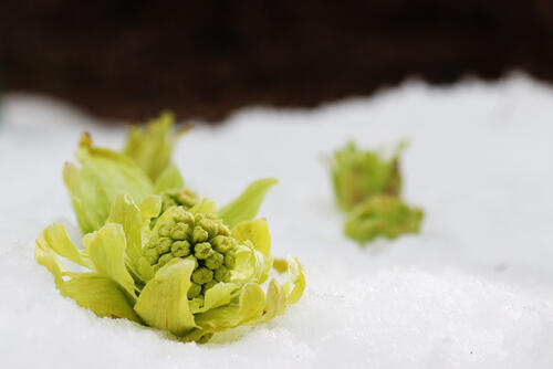 日本には、季節を表す「二十四節気」という言葉がある。これをさらに細分した「七十二候」という暦が存在する。まさに厳寒ともいえる1月20日を、「款冬華(ふきのとうはなさく)」と記す。この款冬こそが、ふきのとうを指すのである。まだ雪に埋もれた季節、ふきのとうは春の準備を始める。暖房器具もなかったその昔には、ふきのとうは春を待ちかねる人々に大きな喜びをもたらす花であったのである。言い伝えによれば、縄文時代には日本人はすでにふきのとうを食していたともいわれている。和食が世界中でもてはやされる昨今といえども、ふきのとうはまだメジャーな食材ではない。しかし、四季の趣向を重要視する和食にとって、ふきのとうはなくてはならない食材なのである。