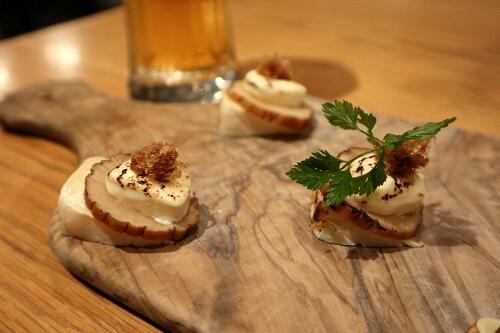 さらに、いぶりがっこを1~3mm程度に薄くスライスする切り方も、食感が大きく変わる。そのうえにモッツァレラチーズやフェタチーズをのせ、オリーブオイルやハーブ、ブラックペッパーを添えてカナッペのようにすると美味しい。