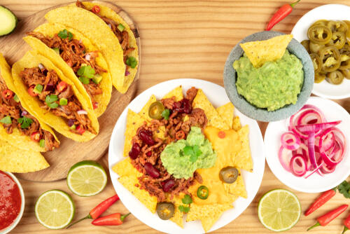 トルティーヤ×チリコンカンといえば、タコス。アメリカでも愛される定番の組み合わせだ。トッピングにはレタス、黄パプリカ、みじん切りの玉ねぎなどが相性がよい。彩りもよいため、ホームパーティーに向いているといえるだろう。