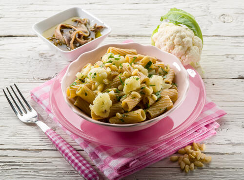 カリフラワーは甘みがあるものの、かなりデリケートな味わいであるため、塩味がきいた食材と相性がよい。たとえば、通常はカリフラワーのパスタには塩味の強いペコリーノチーズの粉をかける。そのほかアンチョビやベーコン、オリーブの実やケッパーを入れても味にメリハリがつくであろう。カリフラワーをペースト状にしたら、よくからむようにリガトーニやペンネなどのショートパスタを使用するのもおすすめだ。