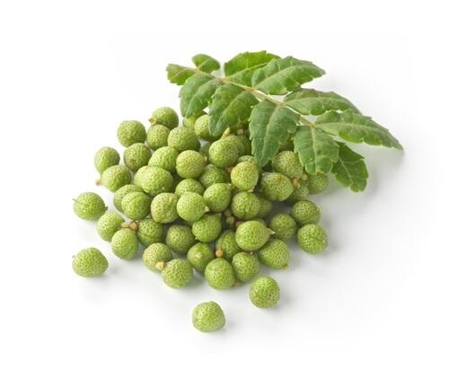 実山椒は成長が進むと硬くなり、皮が割れてくる。この硬くなった実の皮を粉末状にしたものが粉山椒だ。新鮮な山椒の実は鮮やかな緑色をしている。