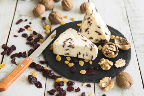チーズにドライクランベリーを練りこんだもの。これだけで十分にチーズケーキのようで、デザートとして楽しめる。ほろほろとした食感にミルクの風味が優しい、マイルドな味わいのチーズなので、クランベリーやアプリコットなどの甘いフルーツにもよくあうのだ。ジンジャー入り、ラズベリーチーズケーキ風などもある。この地域ではドライフルーツたっぷりのケーキやアップルパイに、生クリームの代わりにウエンズリーデイルを添えて食べるのが習慣である。とくにアップルパイは、小さく切ったウエンズリーデイルとりんごを入れて、パイ生地に包んで焼きあげるレシピもある。