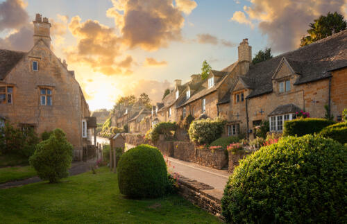 コッツウォルズはロンドンから車で2~3時間ほどの自然豊かな丘陵地帯だ。世界中のガーデニングファンを魅了する、絵本のような風景が広がる。オックスフォード州をはじめとする5州のある地域に、100以上の小さな村が点在しており、この地方特有のコッツウォルズストーンを用いた、はちみつ色の建築物が有名だ。ライムストーンやハニーストーンと呼ばれるそれは、イギリスで一番美しい村と称される街並みを作り出している。