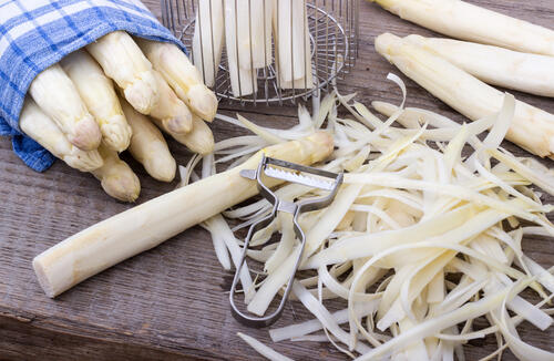 根元の部分を切り落としたアスパラガスは、さらに下部の固い部分だけピーラーで皮をむこう。本来固めの根の部分も、みずみずしさを味わうことができる。さらに高価なホワイトアスパラガスの場合、ピーラーで除去した皮は茹でて味噌汁やスープの具にすることもできる。