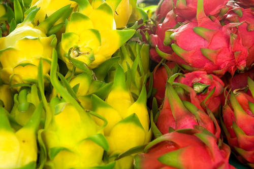 赤や黄色のウロコのような皮が特徴のひとつだ。実はスイカのようなサクサクとした食感で、ゴマのような種があるためプチプチとした食感も楽しむことができる。ドラゴンフルーツは追熟しない果物のため、完熟する前に収穫されている輸入品は、熟しきっていないことが多い。できるだけ新鮮な状態のものを選ぶことが、美味しい食べ方のコツだ。