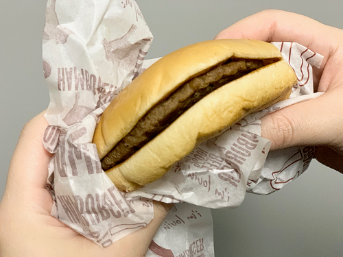 定番のハンバーガー。ビーフ100%パティの美味しさをシンプルに味わうことのできるハンバーガーである。