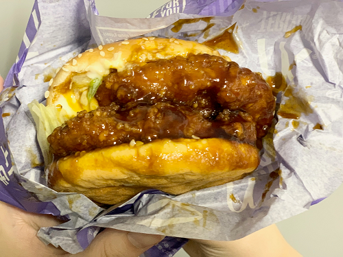 倍てりやきチキンフィレオ。サクサクとしたチキンが通常の倍、2枚挟まっており、甘辛のてりやきソースがかかっていることからこの結果になった。