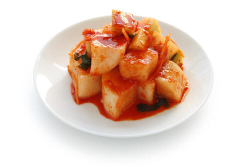 キムチを漬けるときに使う、市販の素を利用するのがもっとも手軽だ。キムチの素とはちみつを混ぜればカクテキの素が完成する。