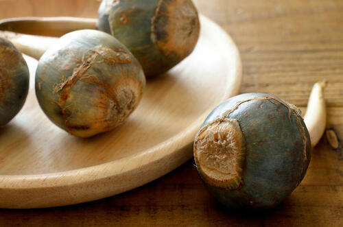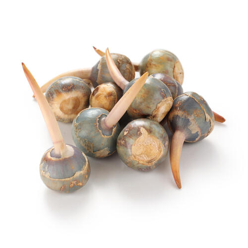 日本で親しまれているのは「青くわい」や「吹田くわい」が主だが、実は見ためはそっくりなのに植物自体が違う「大黒くわい」という野菜があるのをご存知だろうか。大きさや形はほぼ同じなのだが、皮の色が黒く、白い栗のような実が入っているのが特徴だ。青くわいや吹田くわいのようなホクホク感はなく、サクサクとしていて歯切れのよい食感からフライや炒め物に調理して食べると美味しい。この大黒くわいのほとんどは中国の揚子江沿岸で生産され、輸入により私たちの手に渡っている。