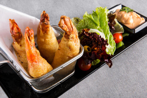 フリットを揚げる油の温度は170~180℃がちょうどよい。そして、揚げ時間は2分ほどを目安にしよう。あまり揚げ過ぎるとエビの水分が抜けてどんどん小さく硬くなってしまうため注意が必要だ。