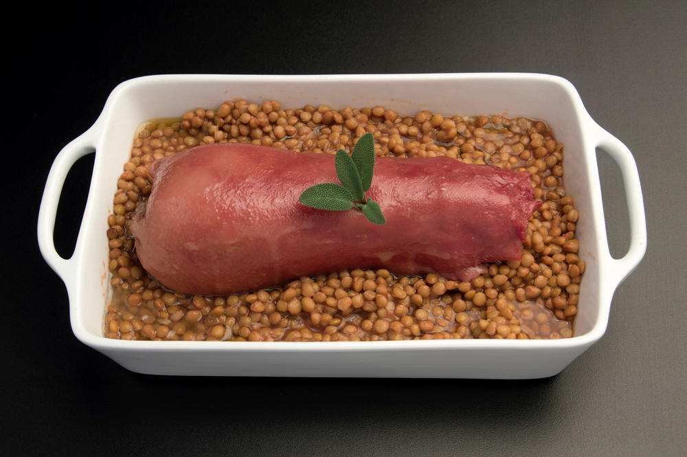 ザンポーネは豚足に詰めるが、同じものを腸に詰めた「コテキ―ノ」という料理もある。