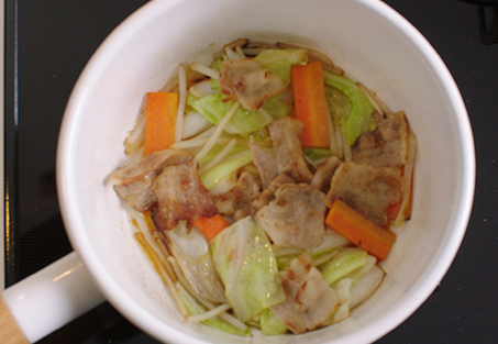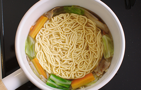 - キャベツがしんなりとしたら、熱湯、麺を入れ、ほぐさずに1分経ったら箸でひっくり返し、少しほぐす。さらに3分ほど茹でる。