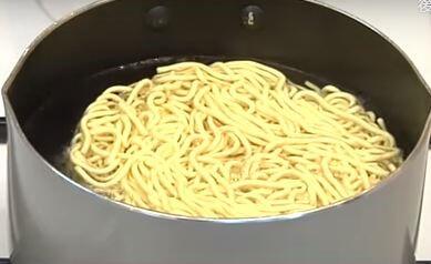 - 熱湯、麺を入れ、ほぐさずに1分経ったら箸でひっくり返し、少しほぐす。さらに3分ほど茹でる。