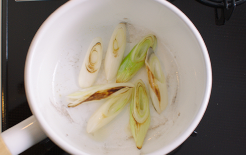 2.鍋にごま油を入れ中火で熱し、長ねぎに焼き色をつけるようにして炒める。焼き色がついたら豚バラ肉を入れて炒める。