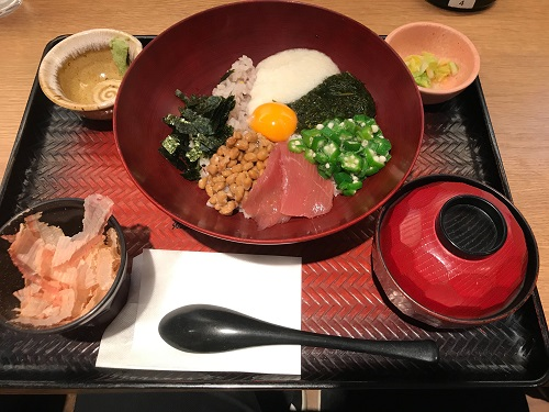 ネバネバ食材を合わせた、パワーが出る丼。オクラ、納豆、とろろにマグロを加えているので満足感&栄養価もバツグン。全体を豪快に混ぜて食べるのが正解だ。