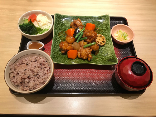 鶏と野菜の黒酢あん定食。さっくりと揚げた鶏の竜田揚げとレンコンや人参、なすなど、たっぷりの野菜を甘酢あんに絡めたメニュー。揚げ物でありながらも酸味が効いていて食べやすく、ごはんがすすむ味わい。しかも野菜をたっぷりと食べることができるので非常にバランスがよい。