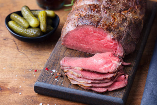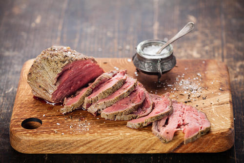 焦げ付きにくく、肉の塊が入る大きさのフライパンを選び、ローストビーフに適している部位であるランプやサーロイン、内ももなどを使って調理を始めよう。火の通りのムラをなくすため、常温に戻した塊肉を焼く。冷めても美味しく食べられるよう、脂は極力包丁などで切り落としておくのがおすすめだ。できあがったら包丁を前後させながらていねいに切ろう。