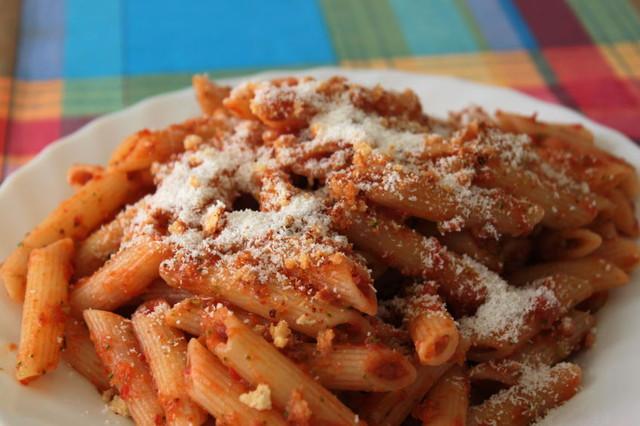 全粒粉パスタは通常のパスタと異なり香りが豊かで、少しパサパサとしているのが特徴である。そのため、パスタソースにはトマトソースや和風ソースなど、全粒粉の特徴を活かせるものを使おう。