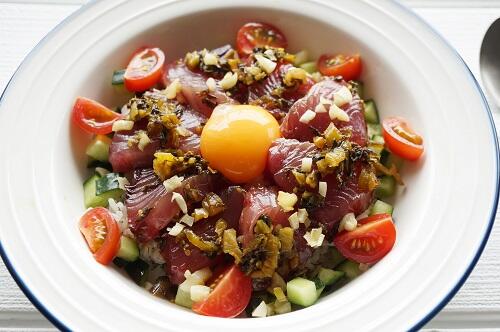 一般的にはマグロの漬け丼のような甘辛いタレが使われることが多いが、それに縛られる必要はない。いつものタレをベースにコチュジャンやゴマを足せば韓国風かつおのたたき丼になる。ゴマ油と塩でシンプルに仕上げた塩ダレもおすすめだ。また、梅と甘酢のタレやマヨネーズを使ったこってりとしたタレ、ステーキに使うようなガーリックソースなども意外と合う。