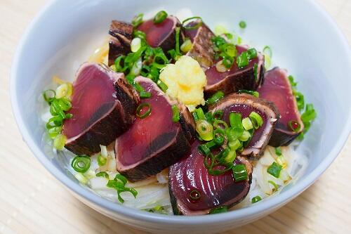 丼にする際にはたまねぎやあさつき、みょうが、大葉などの薬味をたっぷり盛り付けるのがおすすめだ。ごはんとかつおのたたきと野菜を同時に食べられるので、栄養バランスも整えることができる。さらに彩りもよくなるため、簡単なのにおもてなし料理としても活躍する。