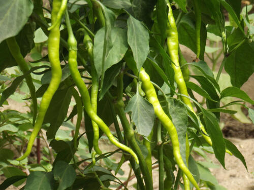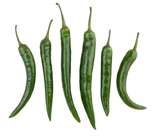細長い形状から、ひもとうがらしは「水引きとうがらし」の別名を持つ。鉛筆よりも細身である見ためが、ひもとうがらしの最大の特徴といえるだろう。太さは約5mm、長さは約10cmに成長する。濃い緑色にはつやがあり、ししとうを想起させる形状にもかかわらず苦みや辛味が少ないことで知られている。