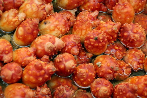 アカホヤ(赤ホヤ)はマボヤと異なり、殻に突起がなく濃い赤色の見た目をしている。また、身はマボヤよりも大きいが、クセが少ないため比較的食べやすいのが特徴だ。流通しているもののほとんどが天然物であり、主に北海道で漁獲されている。また、北海道内で消費されてしまうことが多い。