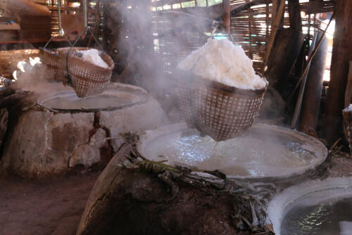 - 塩水を鍋でグツグツと煮て蒸発させる