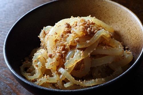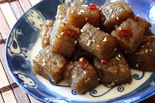 こんにゃくを胡麻油で炒めて、唐辛子でピリッとした味付けにするのが雷こんにゃく。炒める時に油がはねてバチバチッと音がすることから、その名がついたといわれている。かっちりと調味料の分量が決まっているわけではなく、それぞれの家庭の特徴が出る、いわゆる「おふくろの味」の定番メニューだ。