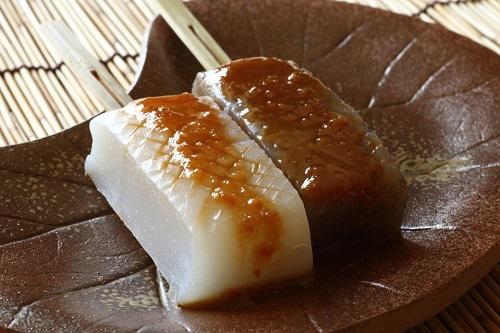 4.こんにゃくを三角や四角など、好みの形に切って、熱湯で茹でる。食べる時はこんにゃくを直接皿に盛ったり、串に刺したりして、上から味噌だれをかける。