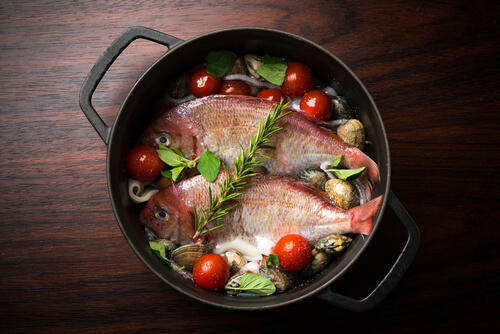 ダッチオーブンを使えば肉だけでなく魚もおいしく調理できる。中でも魚をまるごと豪快に調理するアクアパッツァをおすすめしたい。魚をまるごとダッチオーブンにいれて焦げないように表裏の両面を加熱する。その後えびやあさりなどの魚介と調味料を入れて15分ほど煮たら完成だ。お頭付きで調理すればパーティなどにもぴったりの料理になる。