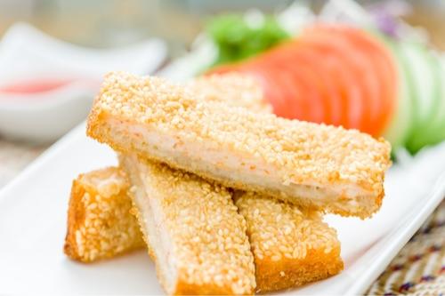 すり身にしたえびを薄切りの食パンに乗せて、油で揚げるアジア料理。珍しい上、ご飯にもお酒のアテにもぴったりだ。スイートチリソースを持参して、つけて食べれば、大人向きの味になる。