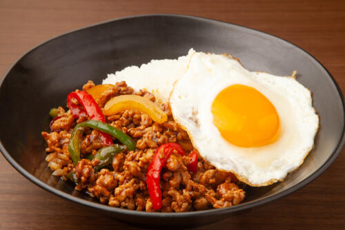 ガパオライスは玉ねぎやピーマンなどの野菜や鶏ひき肉を炒め、オイスターソースなどで味をつけたものと、目玉焼きのせごはんがセットになった料理だ。