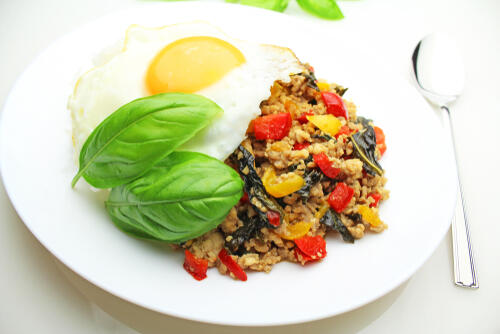 ガパオライスは鶏ひき肉や数種類の野菜をたっぷり使って作られているため、たんぱく質や各種ビタミン、ミネラルなど栄養バランスがよいメニューである。