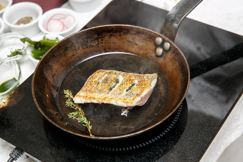 魚を焼くときは必ず皮目から。皮が香ばしく焼きあがったらひっくり返して反対側を焼いていく。身が硬くなるので、最後は火を弱めて余熱で火を通すようにするとよい。調理過程でアロゼすると、より香ばしく焼きあげることができる。魚を焼き終えたあとに残った油で野菜を炒め、仕上げに白ワインや塩こしょうを加えてソースの完成だ。