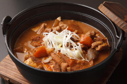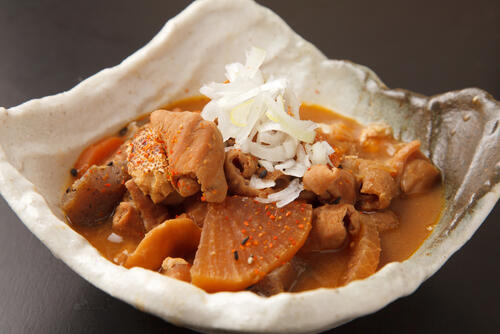 ホルモン味噌煮込みは、豚の小腸や大腸とともに、根菜類やこんにゃくを味噌ベースの出汁で煮込んで作る。ホルモンの旨みと濃いめの味噌味が冷えた身体を温める、冬の寒い時期にぴったりの料理だ。ホルモンとは内臓のことで、「もつ」ともいうことから、ホルモン味噌煮込みは「もつ煮込み」「もつ煮」ともいわれる。